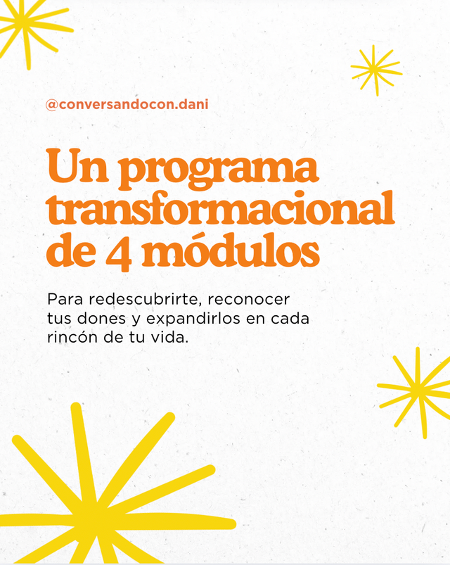 Este es un programa transformacional de 4 módulos, creado para que te redescubras, reconozcas tus dones y los expandas en cada rincón de tu vida: tu familia, tus relaciones, tu trabajo, tus sueños. Aquí no vas a inventarte una nueva versión de ti, sino a recordar la increíble persona que ya eres.