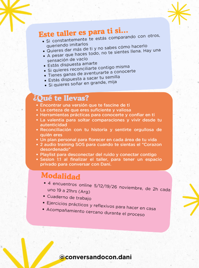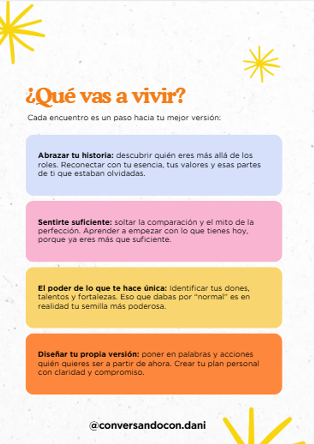 Vas a llevarte herramientas simples y profundas para aplicar en tu vida real, no en "la vida ideal".